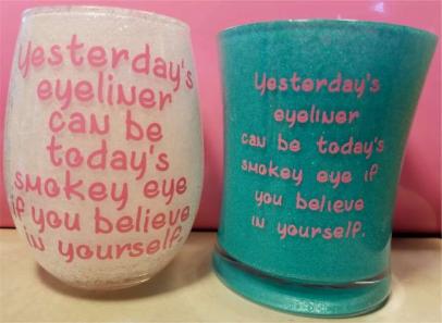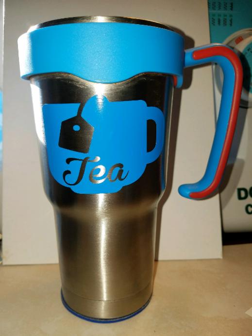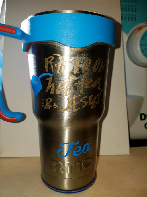 I have several RTic stainless steel cups that I can put vinyl sayings on. They don't come with handles, but I can order some. They take about 30 days for me to receive them. I have 30 oz cups and 20 oz cups. 30 oz cups are $25.00 with a decal and 20 oz. cups are $22.00 with a decal. I can also sell just the decals and you can put them on your own cup!