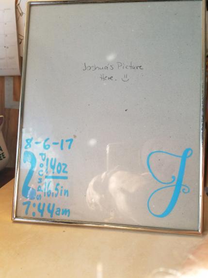 Baby's first picture frame with baby's birth stats and a monogram initial. Prices vary.
