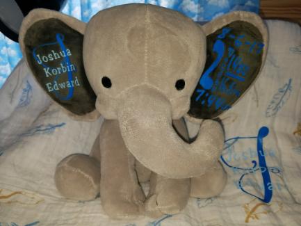 I also make personalized baby gifts like this birth stat elephant and monogrammed swaddle blanket. Prices vary.