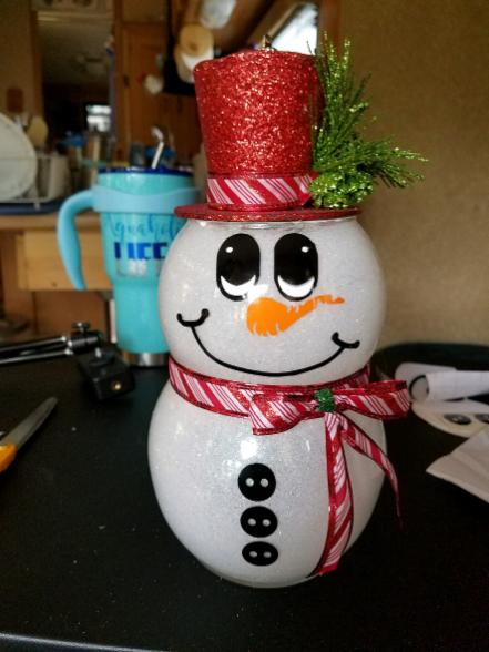 Glass Snowmen. These are about 16" high depending on the hat. They are super cute. I can do any color scheme. $10 each, plus shipping.